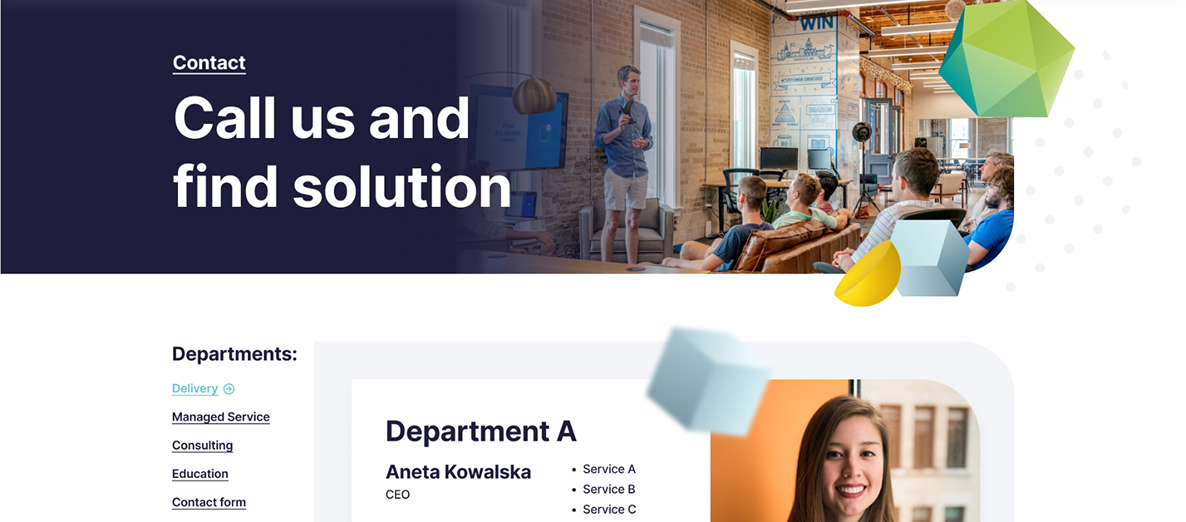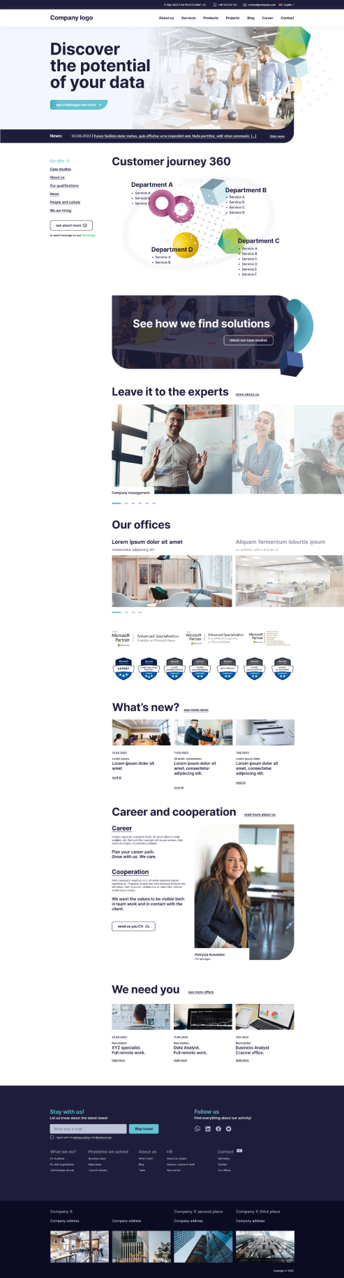 The project was created for a company that specializes in various areas of business support based on data, ranging from data analysis and visualization to the development of complex data warehouse structures, among others. The project aimed to restructure the offering to make it more customer-friendly, following a „problem – solution” approach. Additionally, the service was designed to communicate the professionalism of the team, showcase certifications, and present various collaboration opportunities.